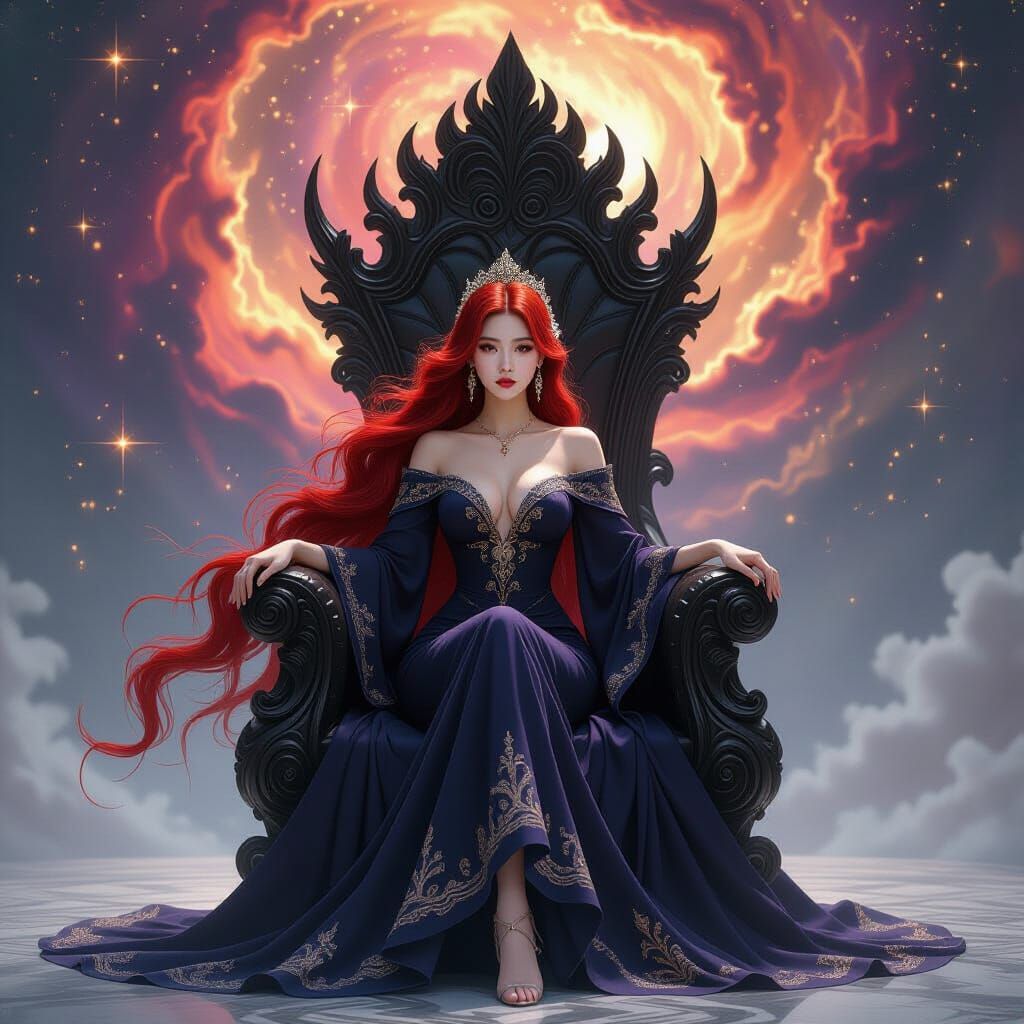 This image depicts a Korean woman with hair in royal flush colors seated on a grand obsidian throne. Cosmic nebula and playing card motifs enhance the epic fantasy concept art.
