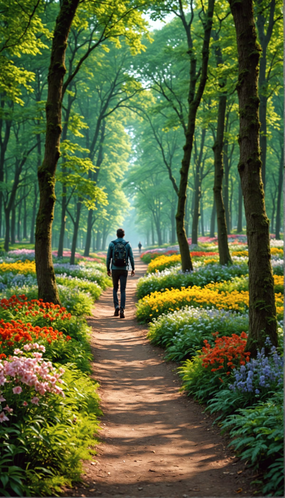A hyperrealistic image of a man walking on a path through a vibrant forest park. The scene is rich with detail, enhanced by HDR and a cinematic high-contrast composition.