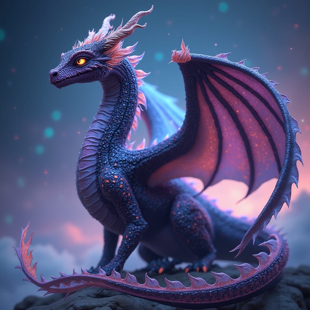This image shows a regal dragon female with shimmering purple and black scales adorned with glittering stars, set against a breathtaking aurora borealis background, evoking a sense of wonder and magic in a fantasy landscape, reminiscent of cyberpunk and digital art styles.