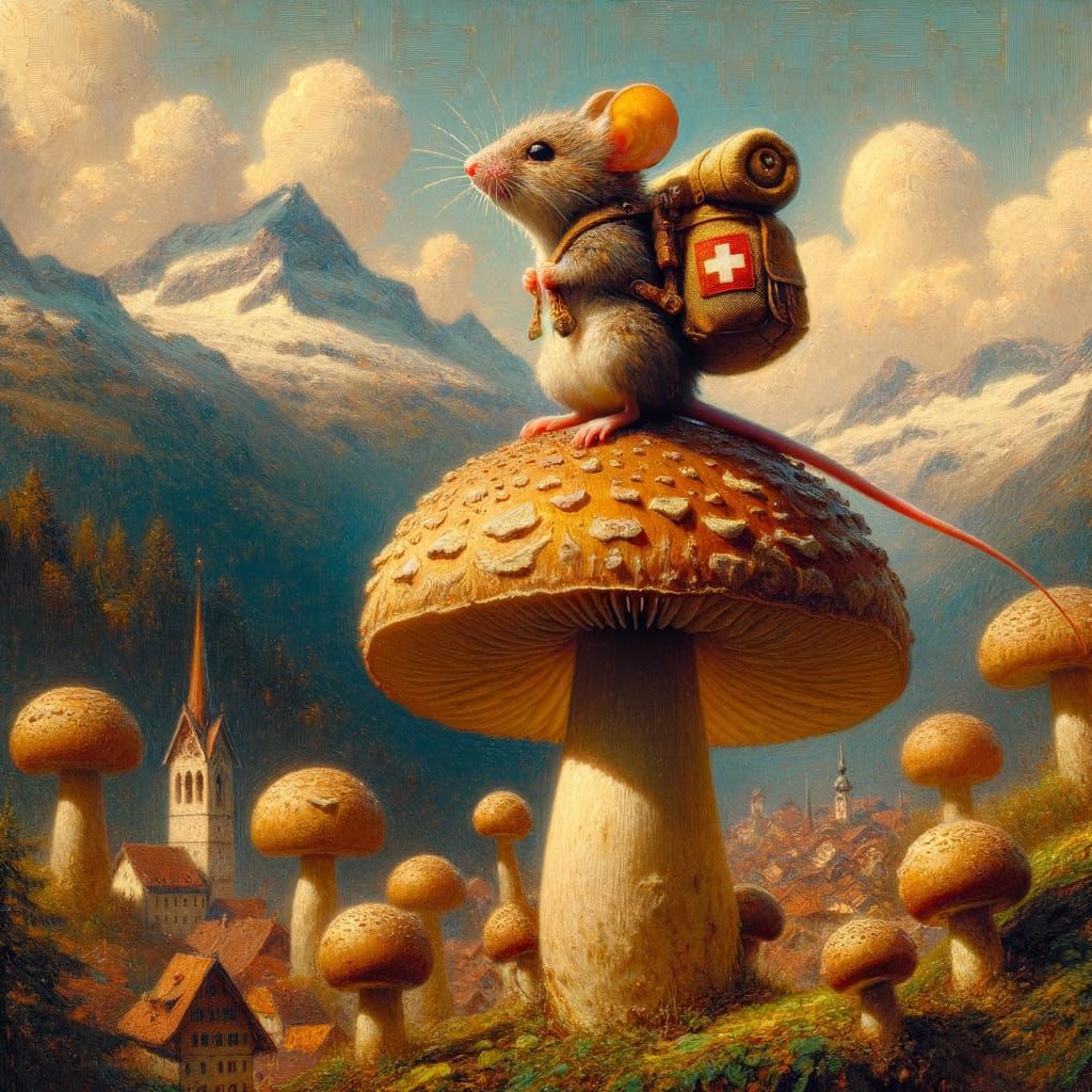 This image shows a tiny, ambiguous mouse adventurer in Swiss attire, perched on a giant mushroom. It gazes over miniature villages in a post-impressionist oil impasto style with heavy brushstrokes.