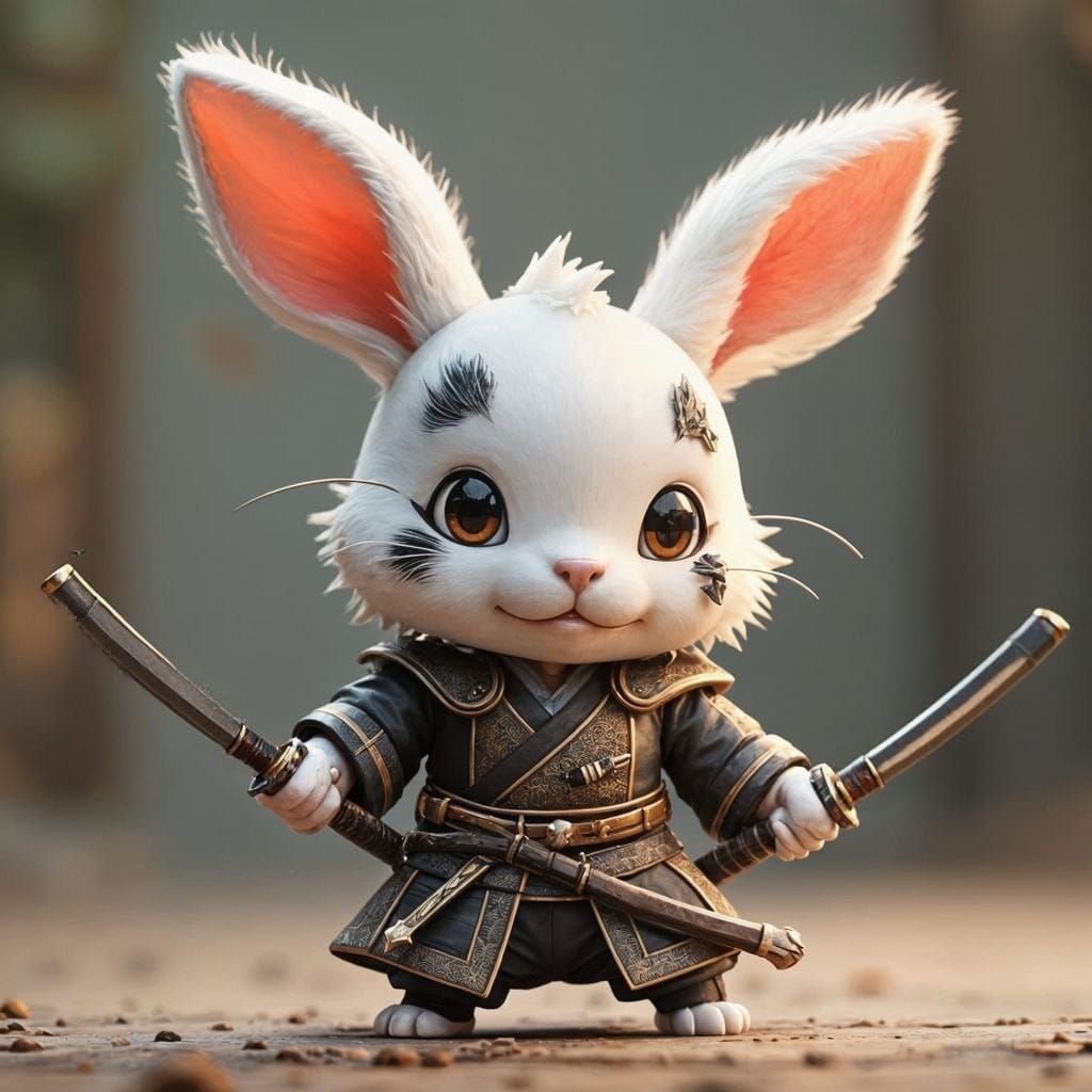 A stunning 3D anime artwork featuring a regal white rabbit armed with two swords, showcasing breathtaking detail and an ultrafine aesthetic reminiscent of high-end concept art.