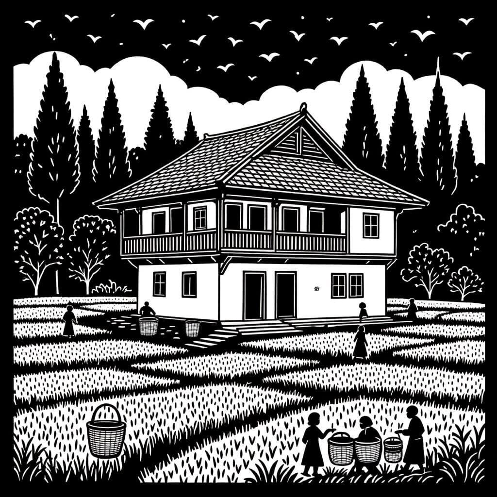 A clean, bold line art illustration of a traditional Gilan house amidst rice fields and tea bushes. Features festival details and community celebration in a vector style.