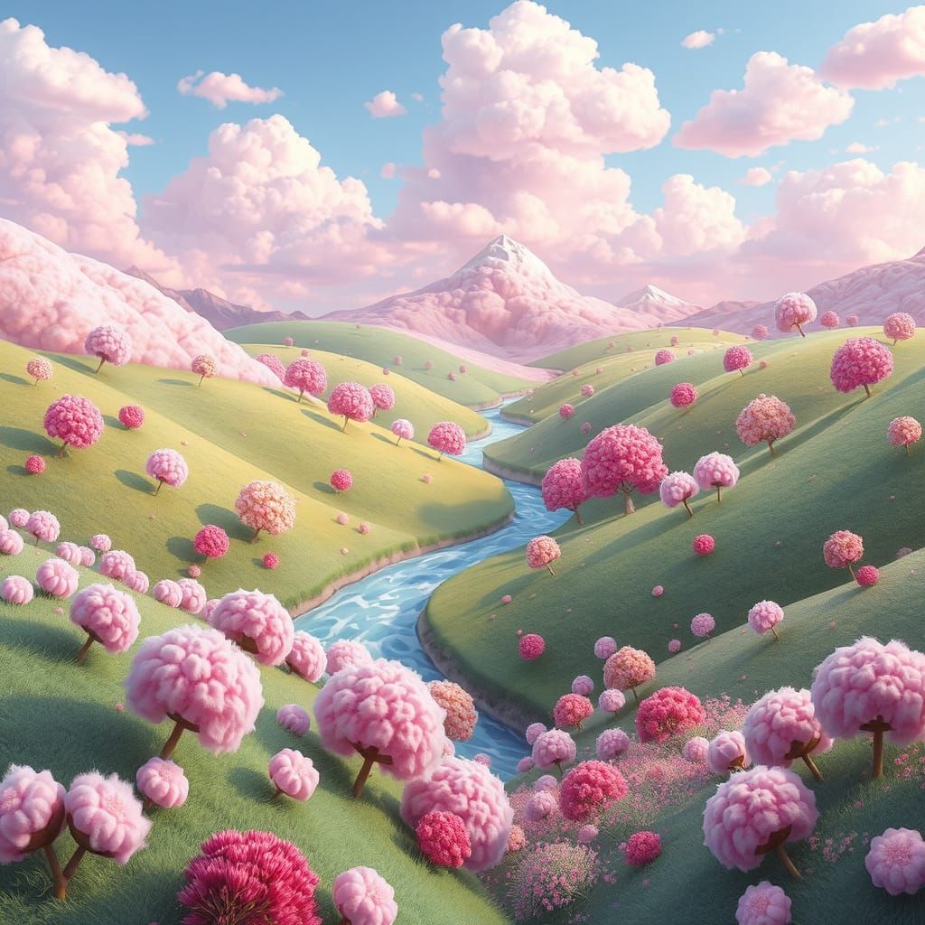 A whimsical landscape where rolling hills are made of fluffy pink cotton candy, dotted with lollipop trees and gummy bear bushes. A river of fizzy lemonade flows through the valley, under a sky filled with marshmallow clouds. The style is vibrant and playful, like a children's book illustration with a touch of surrealism.