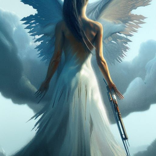This image shows a surreal scene with an angel, a tree, and a white dragon in a post-apocalyptic landscape. The artwork features abstract, hyperdetailed elements and triadic colors.