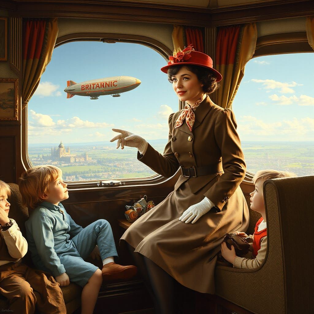 A vintage-style advertisement of Mary Poppins caring for children aboard a luxurious airship. The whimsical illustration features soft colors and intricate details, reminiscent of classic children's book illustrations.