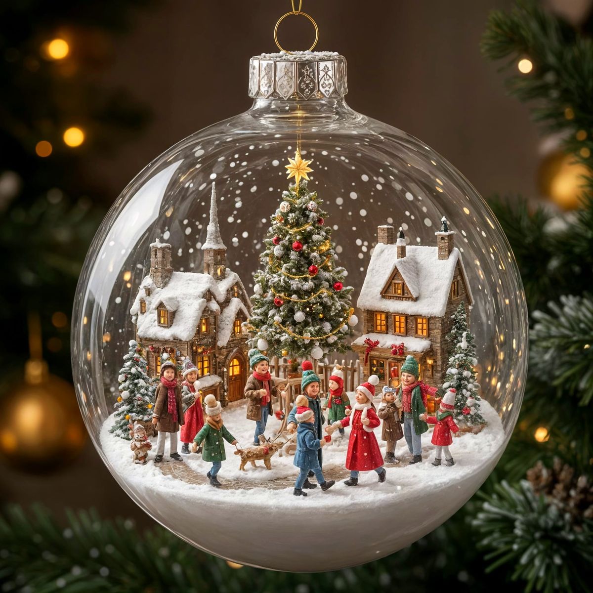 This hyperrealistic image showcases a hollow glass Christmas ornament filled with a detailed snowy village and strolling villagers. A magical winter wonderland captured in exquisite detail.
