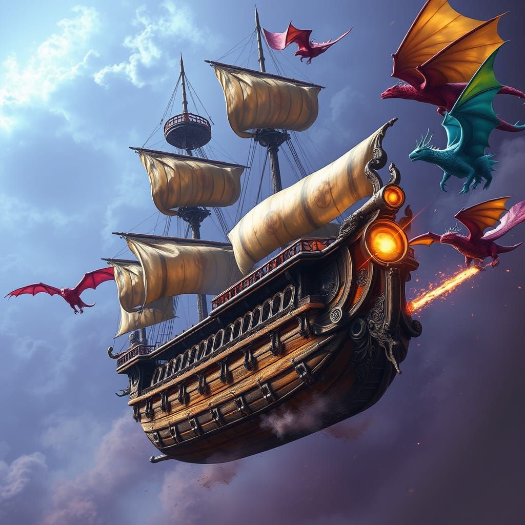 This image shows a majestic flying airship in a treacherous space dust sky, engaging in a fierce battle with two flying dragons. The airship's wooden hull is weathered and worn, with cannons blazing as it endures the ferocity of the dragon's assault, set against a rich and vibrant palette of purple, yell...