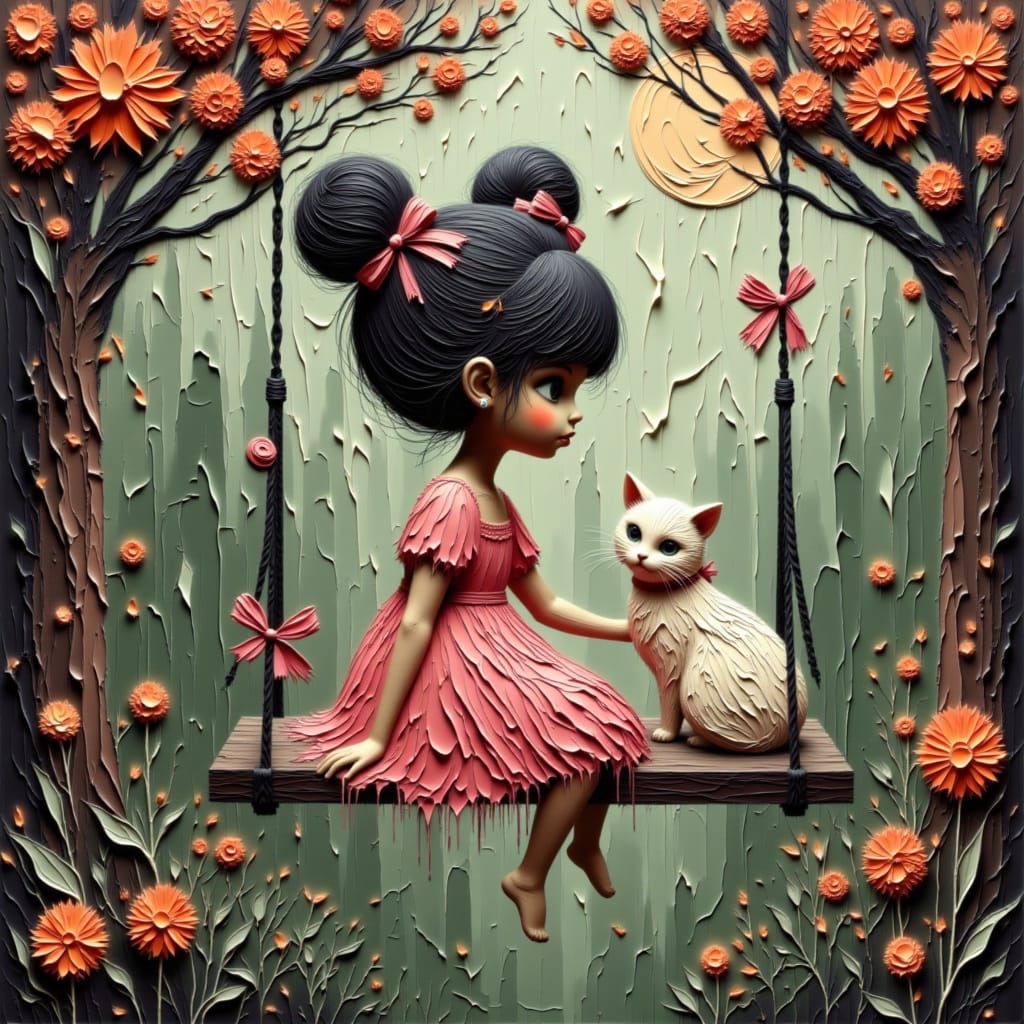 A child gently pets her cat while sitting on a swing in a beautiful garden setting with abundant flowers and trees. Abstract vector fractal art with 3D shading.