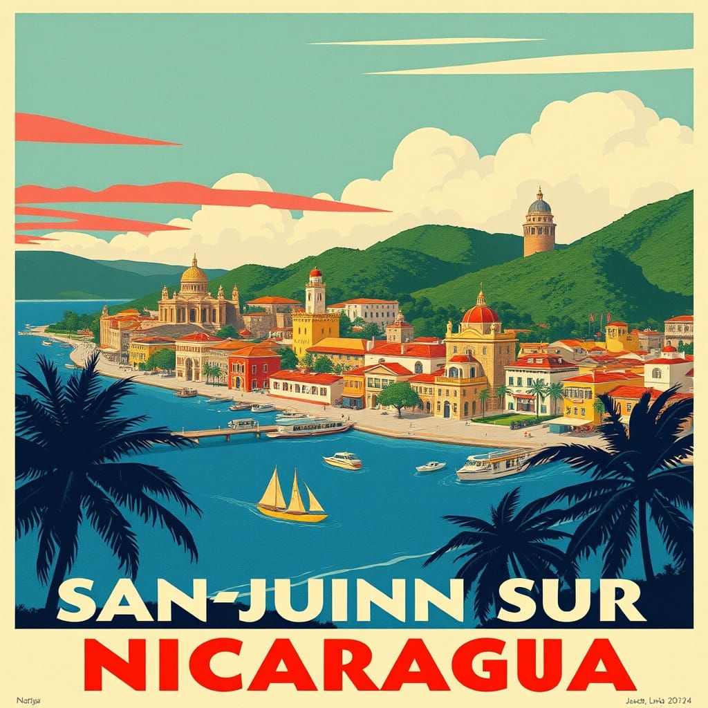A vintage travel poster showcasing San Juan Del Sur, Nicaragua, with a vibrant townscape. The design evokes 1940s artistry, featuring bold lines and geometric shapes in an Art Deco style.