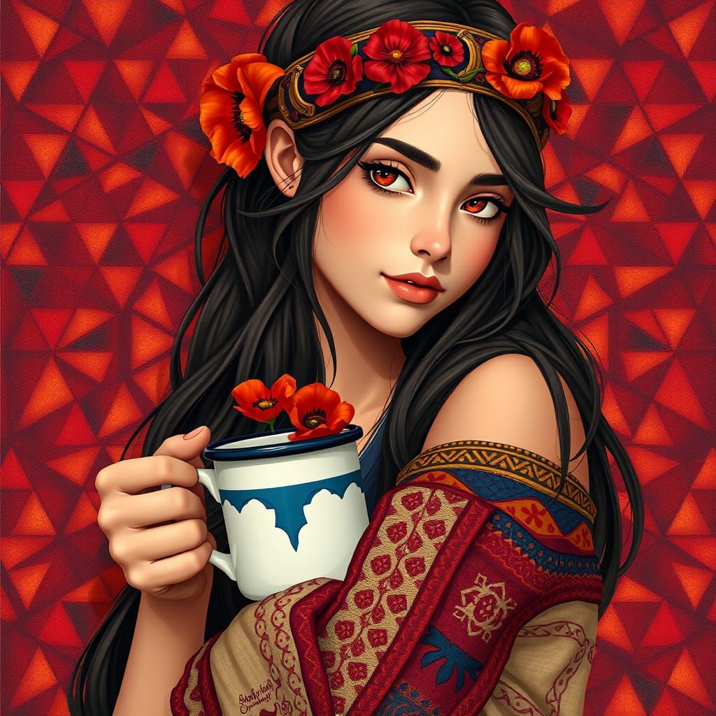 This enchanting image depicts a young woman with a bohemian flair, surrounded by intricate textures and details in a warm, vibrant color palette. She wears a headband adorned with poppy flowers and cradles a delicate mug, set against a mystical background of interconnected triangles, evoking ancient symb...