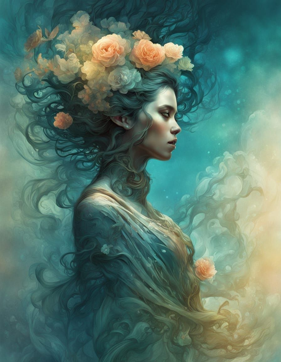 A surreal portrait of a pregnant woman in a flowing dress, bathed in golden hour light. Features shimmering water drops and a dreamy glow, rendered in an alcohol ink style.