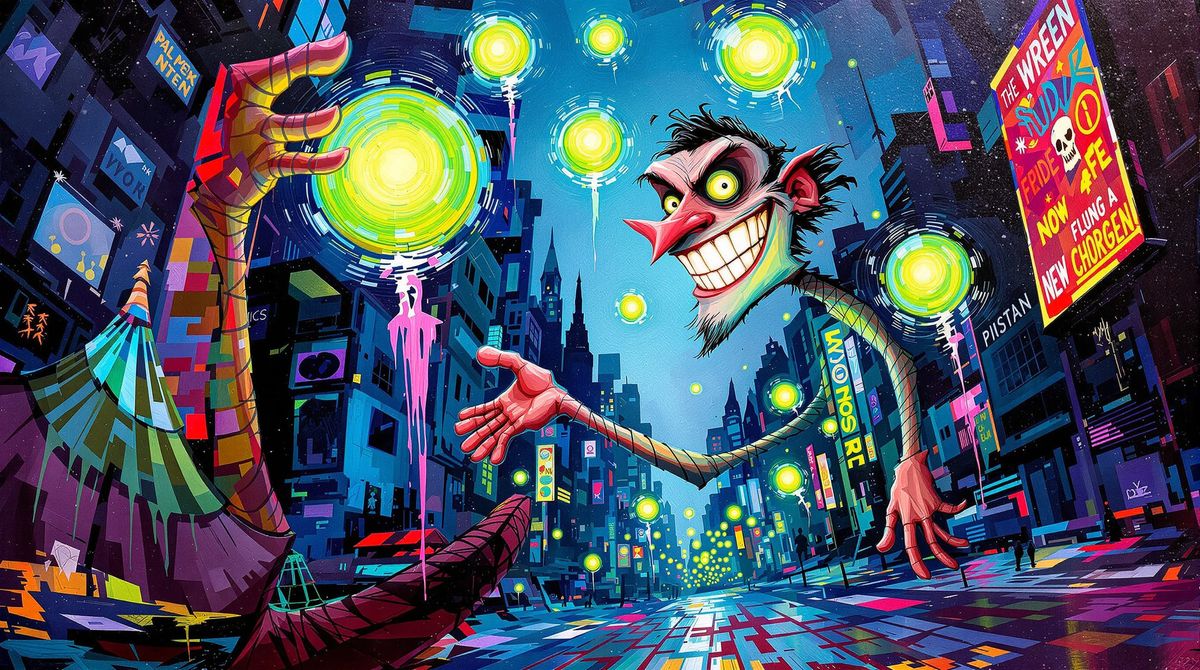 This impasto acrylic painting captures a street performer's joyful juggling of glowing orbs against a vibrant, distorted cityscape. Features bold lighting and energetic brushstrokes.