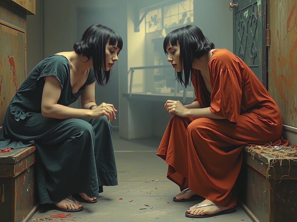 This image shows a woman in dark clothing clinging to a black metal door. Natural light illuminates her in a scene that blends Byzantine and gothic horror elements, rendered with gouache techniques.