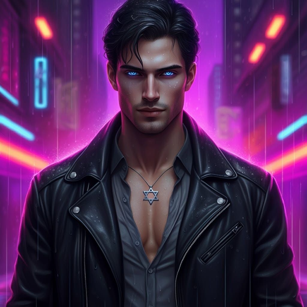 This image shows a man with dark hair and steel-blue eyes standing on a wet city street. The scene is illuminated with neon lights and rendered in a futuristic neon noir style.