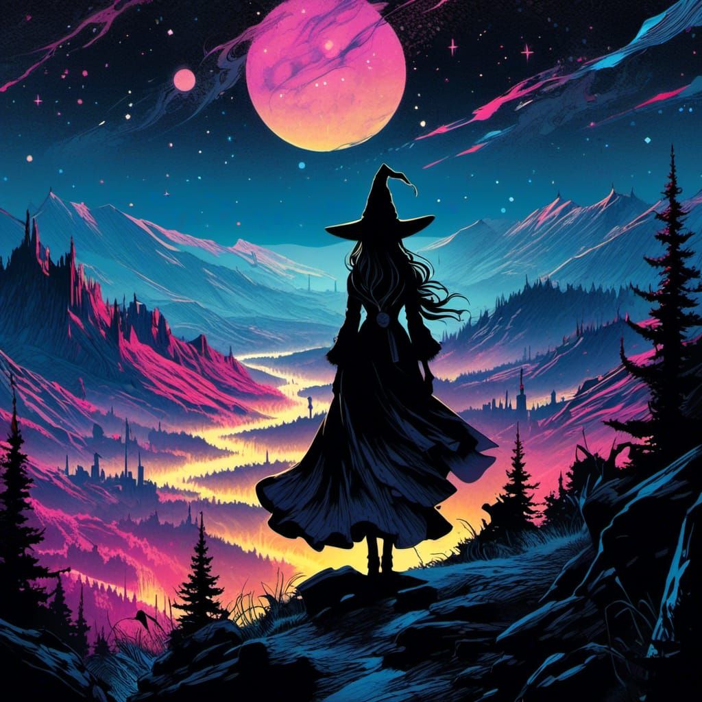 This image shows a silhouetted witch on a mountain gazing at a starlit city. It's rendered in a colorful inkpunk aesthetic with line art and graffiti elements.