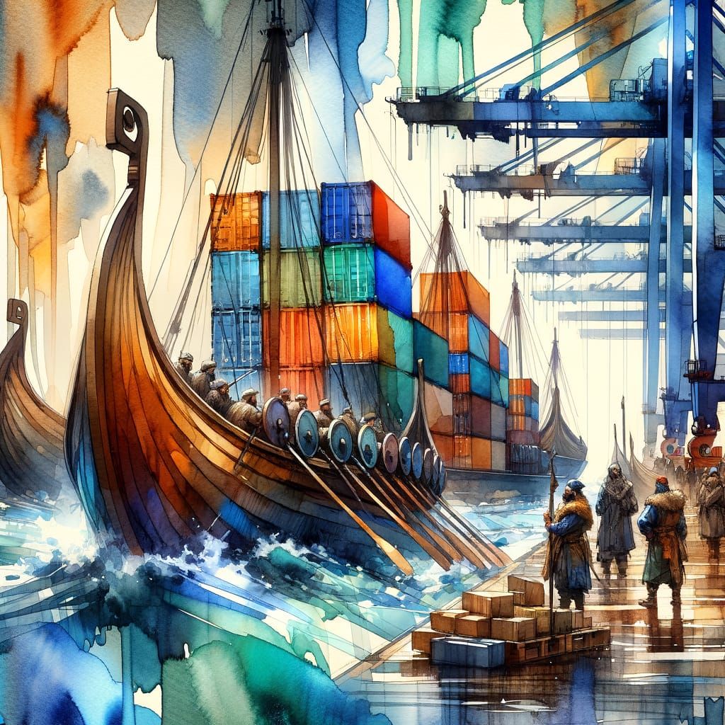 This image shows a vibrant harbor scene blending ancient and modern elements. Viking longships and cargo vessels are juxtaposed in watercolor washes, illustrating a dynamic port with sailors loading containers in a fluid, colorful style.