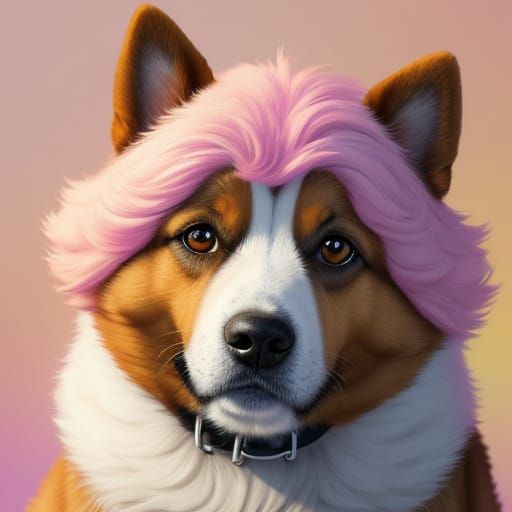 A charming digital painting of a dog in a cartoon style. The portrait features fluffy fur, big brown eyes, and a pastel color palette with warm lighting, rendered in 4k resolution.