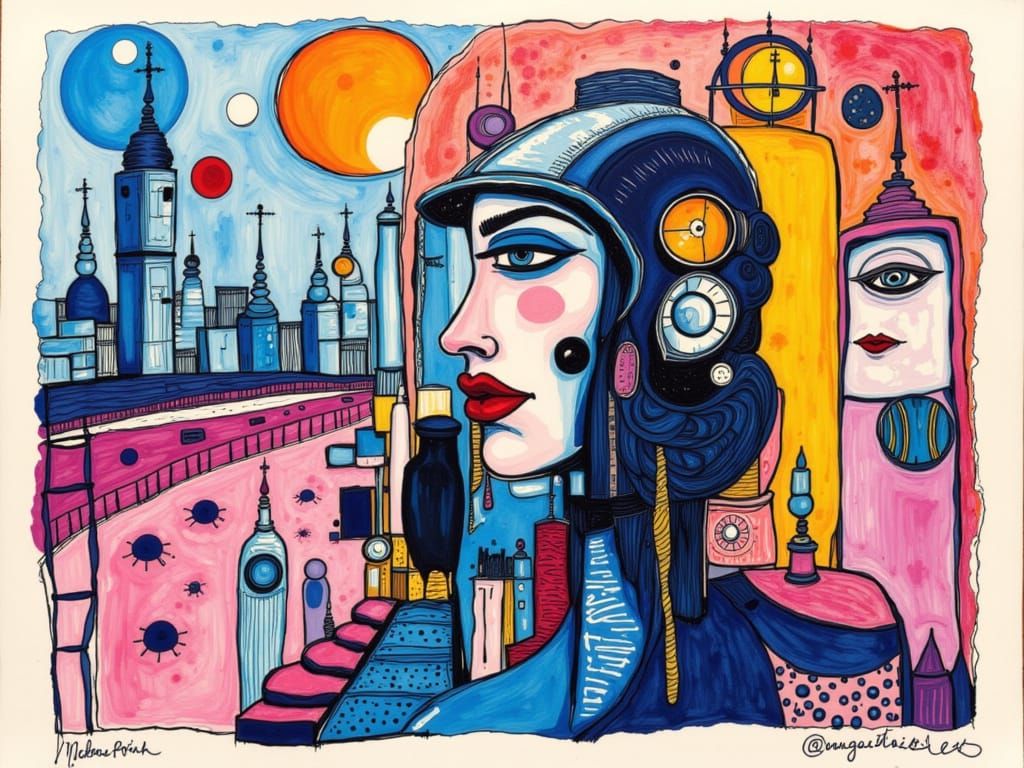 This alcohol ink painting depicts a surreal scene of a woman on a speeding motorcycle. The artwork features psychedelic colors and a cheering crowd in the stands.