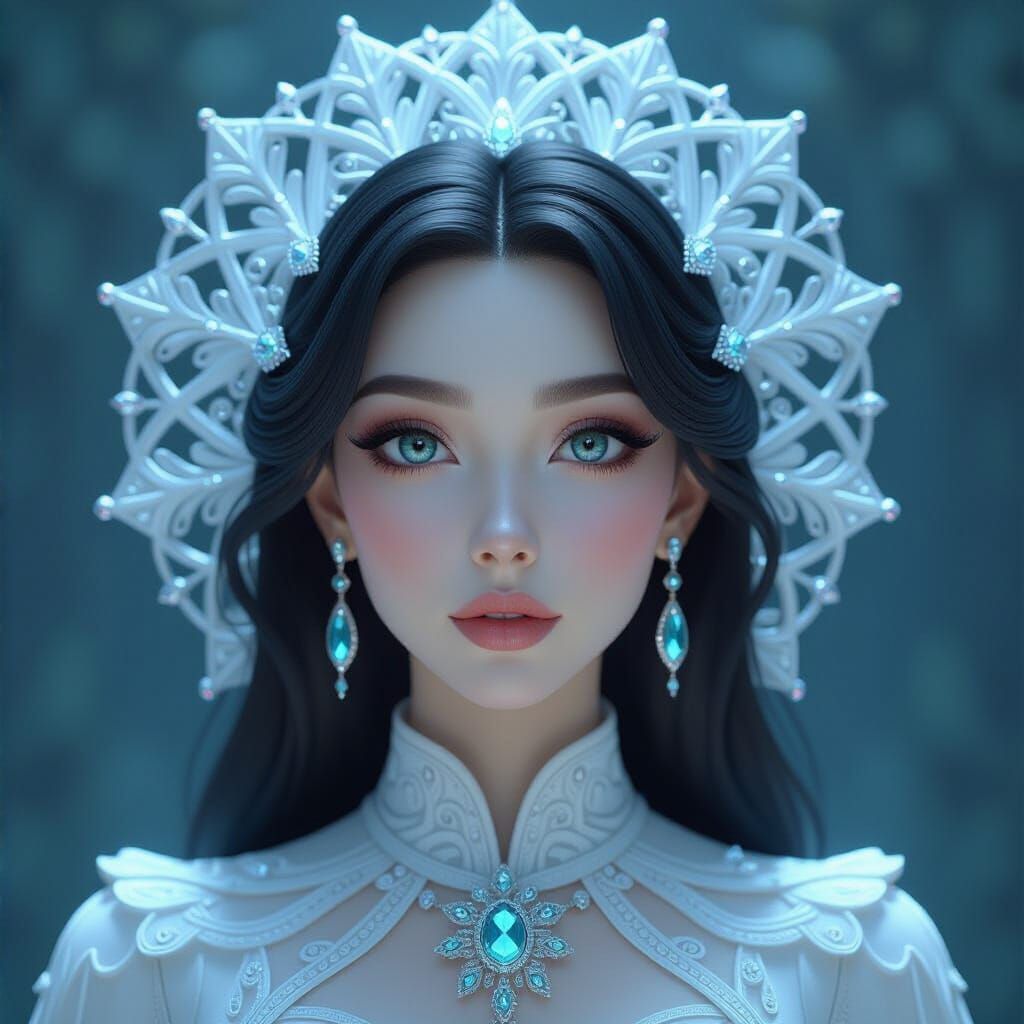 A symmetrical portrait of a woman with intense eyes. The image presents an intricate, interconnected design with swirling depth and fine details, rendered in a stained glass and marbled style.