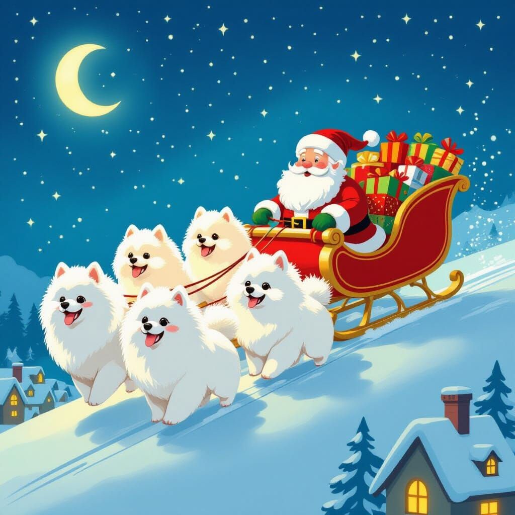 A whimsical illustration of nine white Pomeranians pulling Santa's sleigh on a starry Christmas Eve. Santa delivers toys from a sleigh laden with gifts, set against a glowing, vibrant atmosphere.