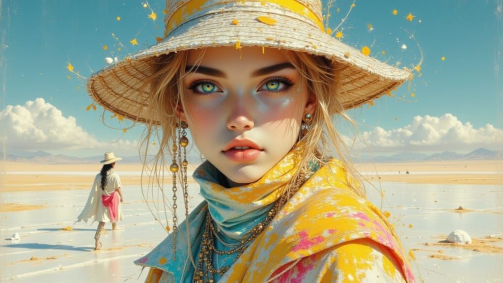 This image shows beach sailors on the Salar de Uyuni salt flats, rendered in a hyperdetailed concept art style with volumetric lighting and triadic colors for a splash art aesthetic.
