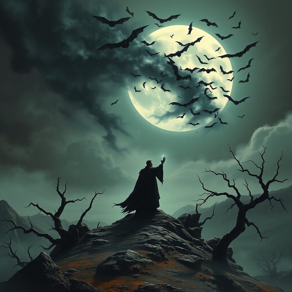 A striking picture of a vampire shaman silhouetted against a full moon on a desolate mesa. He summons a swirling storm of bats in a dark fantasy aesthetic with dramatic lighting.