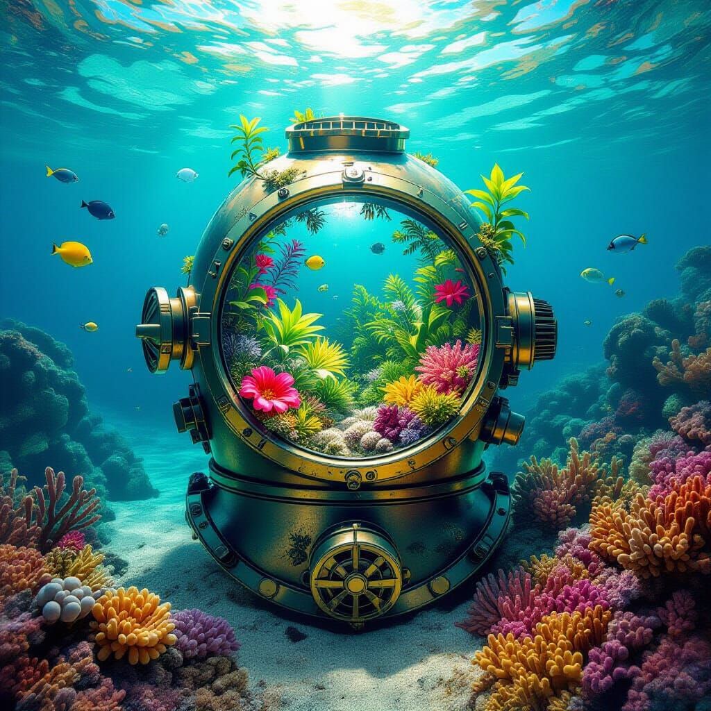 This image shows a vibrant garden flourishing inside an old diving helmet on the seabed. Colorful coral and marine life surround the helmet, rendered in photorealistic detail to capture the beauty of the underwater scene.
