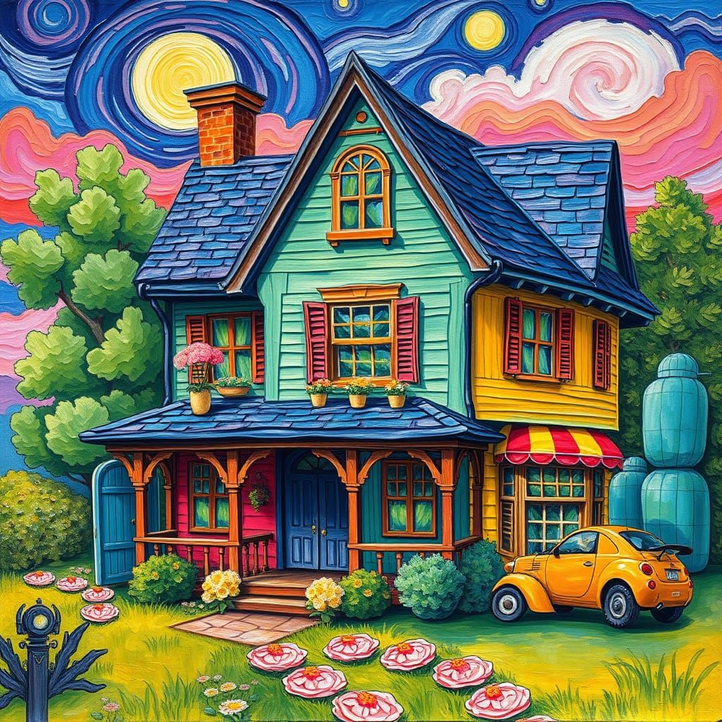 This image depicts a vibrant, whimsical house rendered in bold, expressive brushstrokes, with thick layers of gouache and watercolor paint, evoking a textured, three-dimensional quality reminiscent of Impressionist art with maximalist flair.