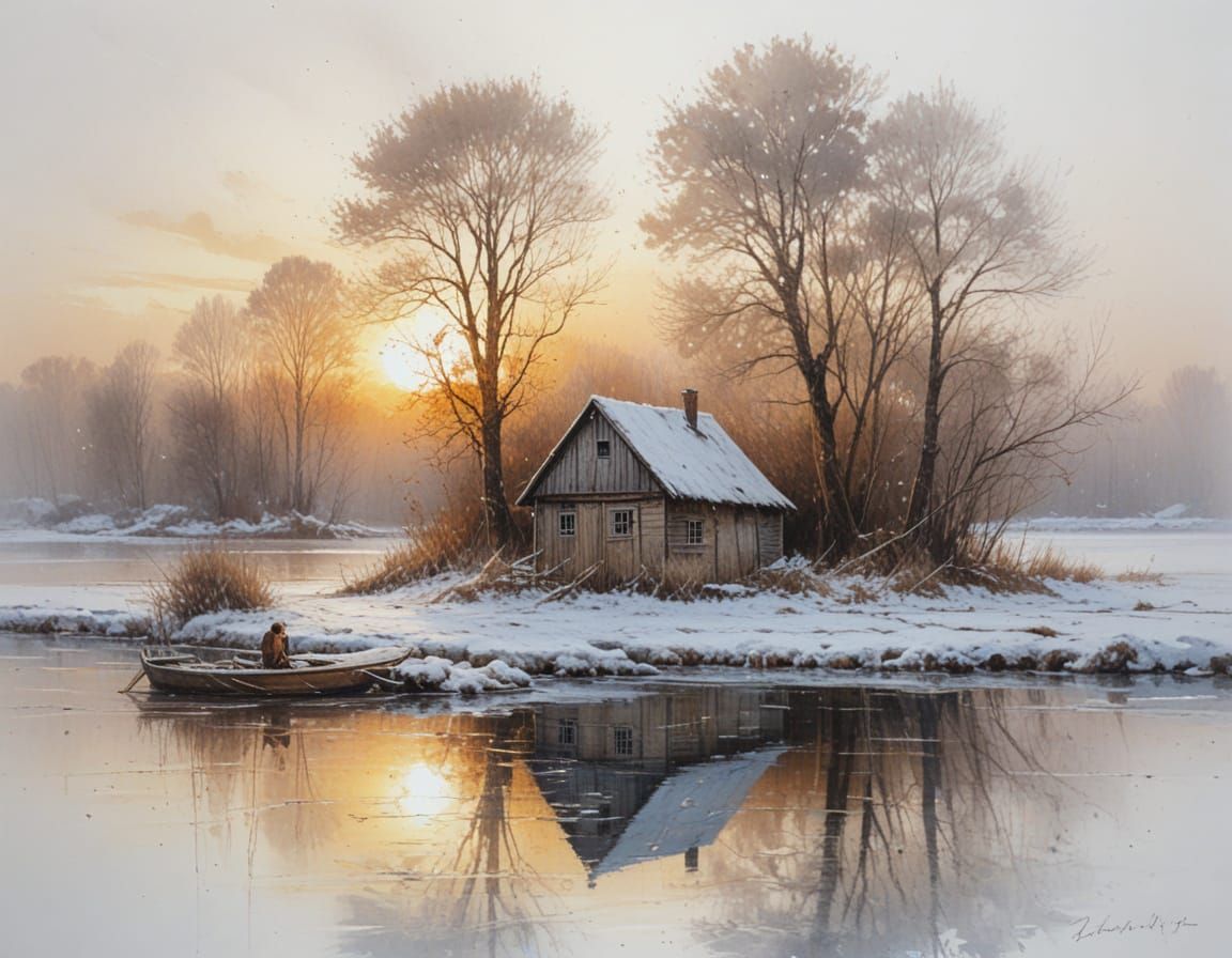 This image shows a tranquil winter scene with a frozen river bend at sunrise. A cozy fisherman's hut with illuminated windows sits on the bank, reflected on the ice. Rendered as a luminous watercolour painting.