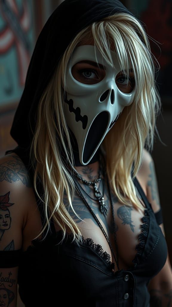 A hyperrealistic image of a blonde goth woman wearing a Ghostface mask. She is dressed in alternative clothing and displays many colorful tattoos. The image is high contrast with cinematic lighting.