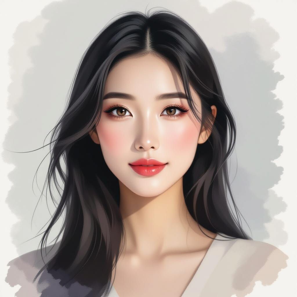 This hyperrealistic watercolor painting features a graceful Chinese woman with fair skin and a gentle smile. The subtle, misty background enhances her refined features, created with soft, atmospheric watercolor techniques.
