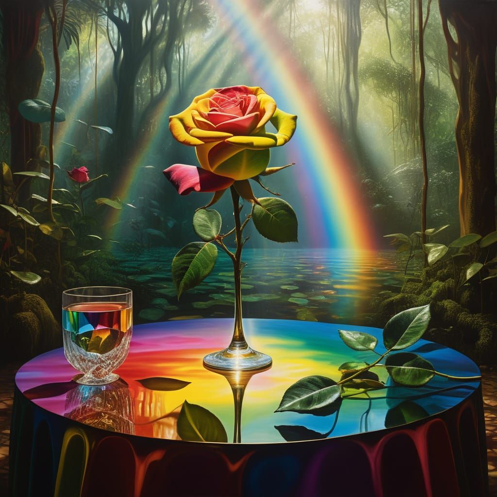 A surreal image depicting a glass rose illuminated by refracted light. The rose sits on a table within a lush jungle, rendered in vibrant triadic colors and warm, golden light as a surrealist oil painting.