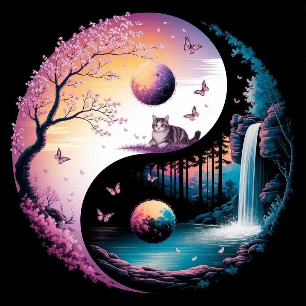 This image shows a detailed Yin Yang symbol with contrasting halves. One side features a sunset landscape, cherry blossoms, butterflies, and a cat. The other side displays a forest with a waterfall in vibrant colors.