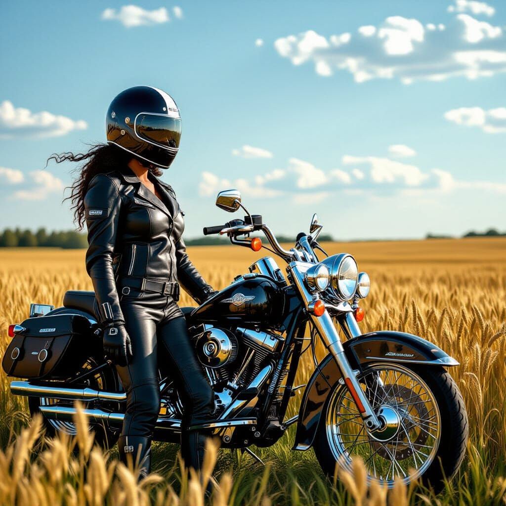 This image captures a biker in leather chaps and helmet with visor, standing next to her motorcycle in a wheat field landscape. The photo has a vintage film grain effect.