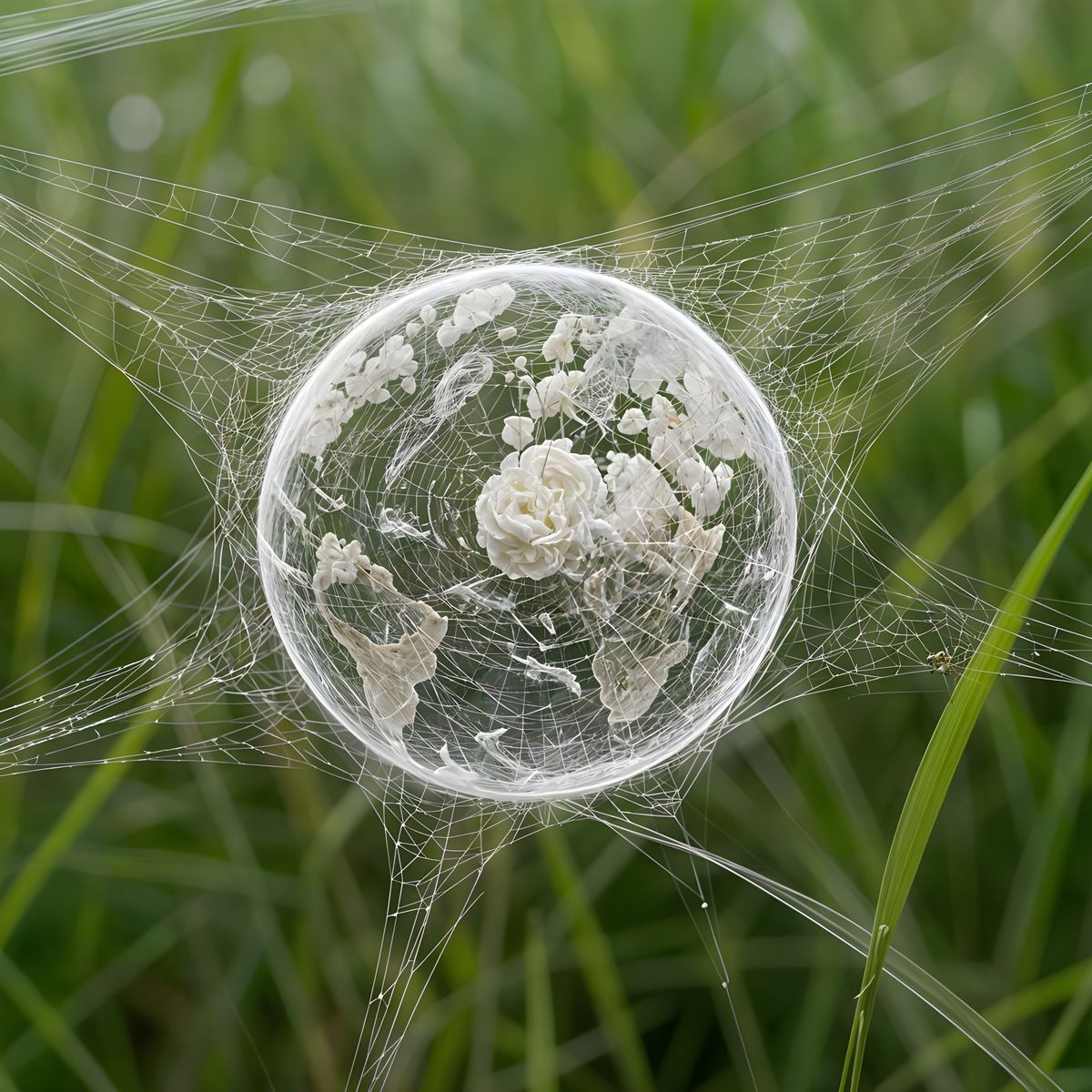 This image depicts planet Earth intricately crafted from translucent white spider silk, suspended delicately between blades of grass, showcasing fragility and resilience.