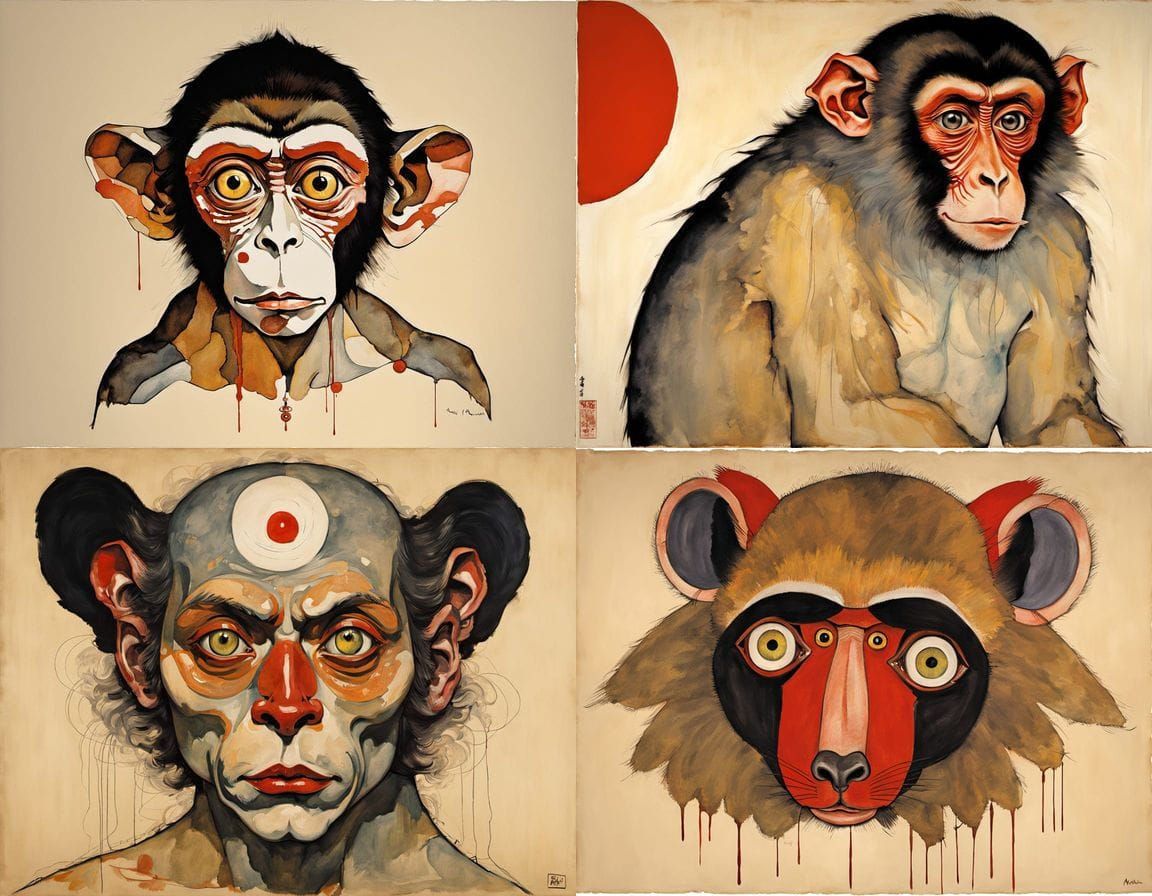 This surreal artwork depicts a bizarre mutant baboon shark with scales and a peacock's beak, rendered in a hyperdetailed Japanese sumi-e style with contrasting retro colors.