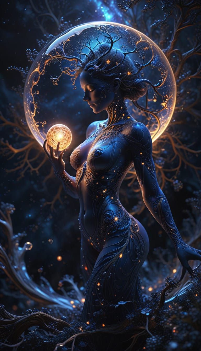 This image shows a mesmerizing, glowing fractal cosmos at the heart of a luminous orb, surrounded by a nurturing figure. Softly glowing fractal tendrils blend with cosmic patterns, creating a balance of organic and celestial elements.