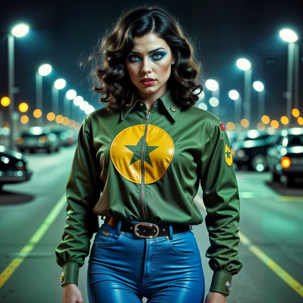 This image shows a woman with striking eyes and heavy makeup in a retro futuristic parking lot. She wears a green shirt and blue leggings, looking directly at the viewer.