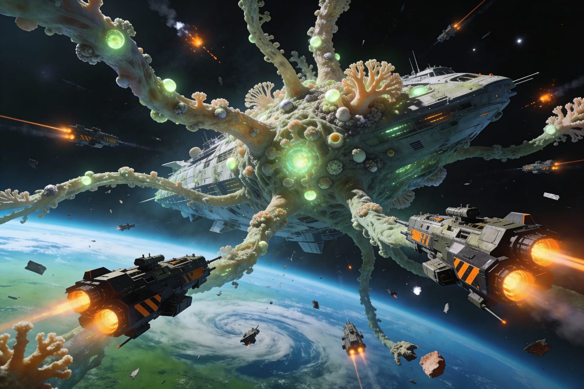 A colossal, living coral spacecraft consumes industrial gunships in orbit above a blue-green planet. Bioluminescent nodes pulse on its hull as it draws in attackers.