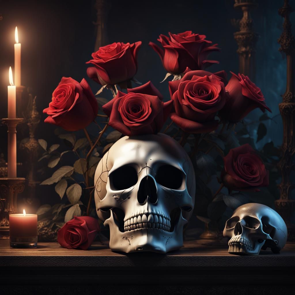 A detailed matte painting of a nighttime still life. The image features roses and a skull, rendered with deep colors, intricate details, and complementary colors in a fantastical style.