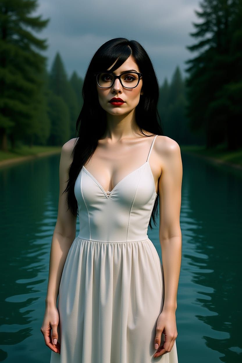This image shows the mythical La Llorona by a lake. She is depicted with long hair and a white swimsuit, rendered with haunting and ethereal qualities and dark fantasy elements.