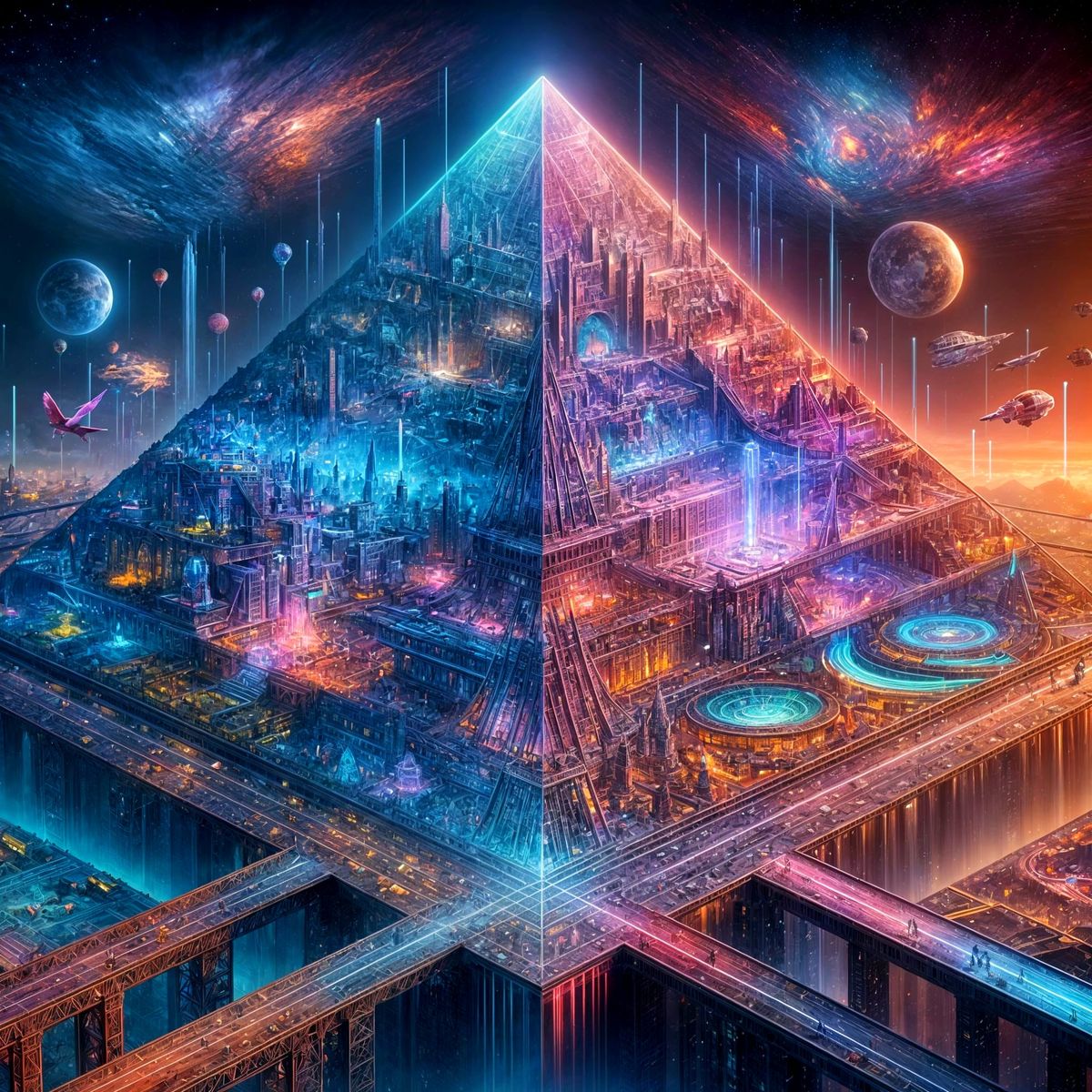 This image shows a colossal glass pyramid with neon pink and blue hues, surrounded by roads leading to futuristic cities, ethereal realms, and stunning waterfalls, in a surrealistic high-tech scene with cinematic atmosphere and hyperrealistic details.