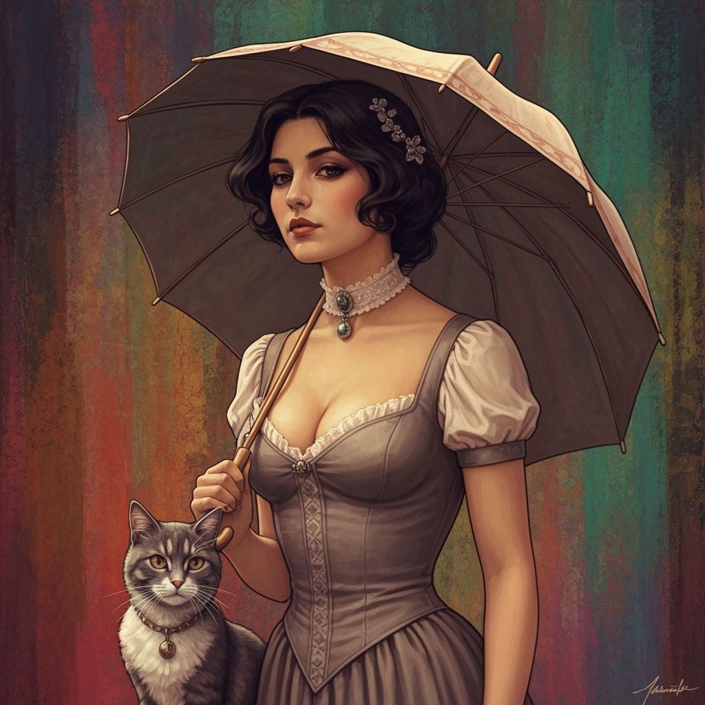This image shows an elegant Latin woman in a fitted dress holding a parasol, with her cat beside her. The image is digitally painted with intricate textures and vibrant colors, reminiscent of Art Nouveau.