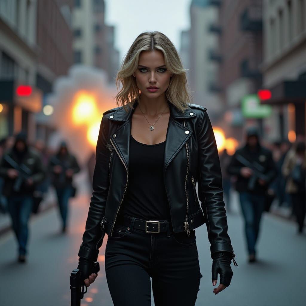 A striking picture of a young woman with light hair and green eyes, holding a gun and walking down a city street. Armed figures follow her as an explosion erupts in a cinematic style.