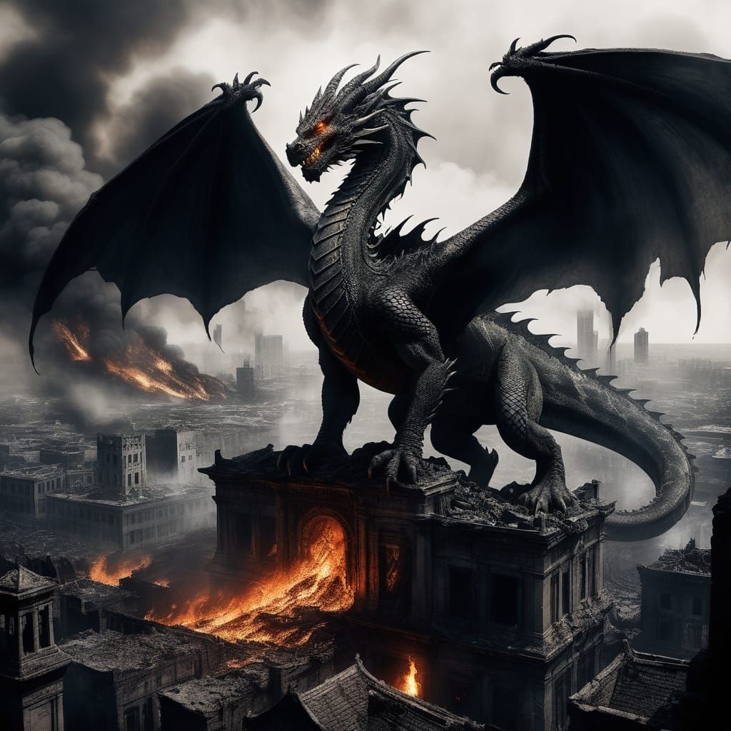 This charcoal drawing depicts a majestic dragon soaring through a smoldering apocalyptic cityscape, surrounded by smoke and embers. The dragon's wings feature glowing tattoos of ancient runes, set against a backdrop of dramatic lighting and deep shadows.