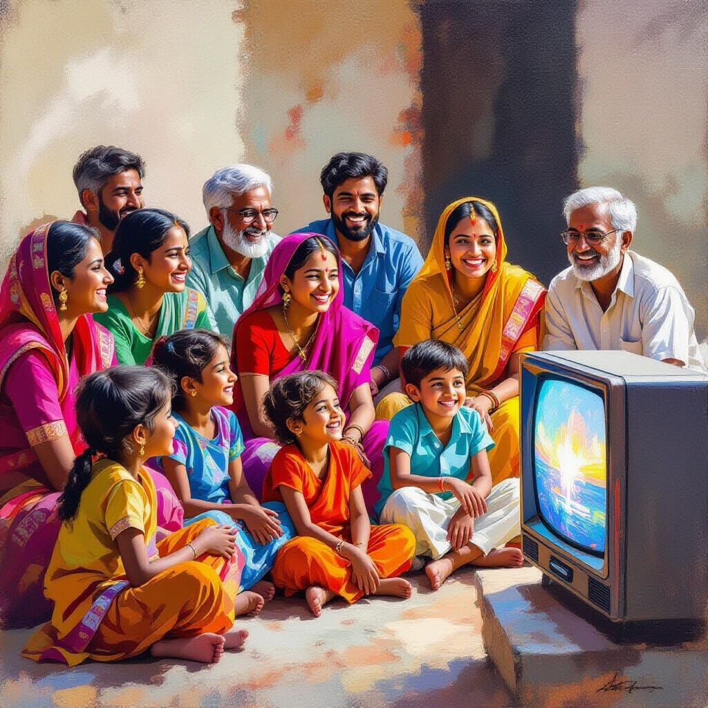 Generate unique images of Indian villagers, children, and elders watching TV. Free and easy AI art creation.