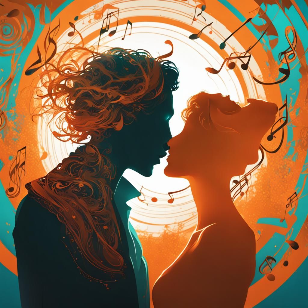 This image depicts musical notes flowing from a woman's mouth to a man's ear, rendered in a detailed, high-resolution concept art style with dramatic lighting and triadic colors.
