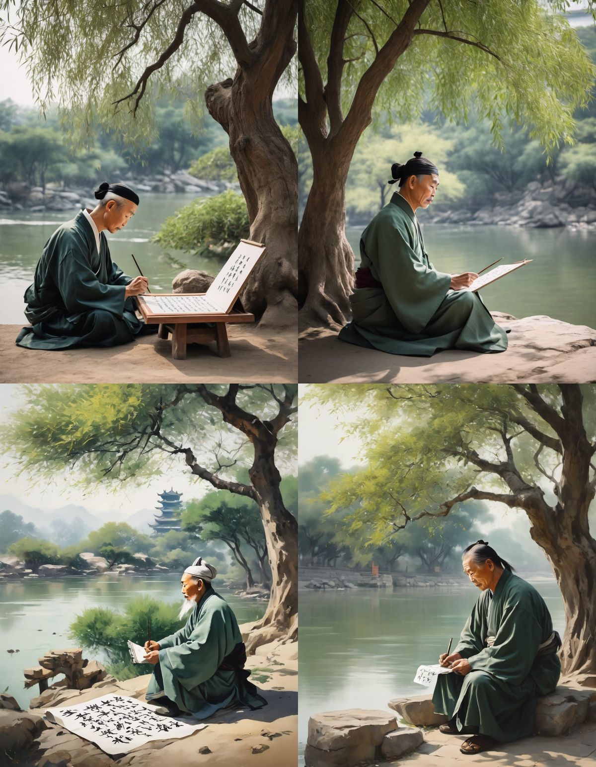 A wise Chinese sage sits peacefully under a tree by a flowing river, engrossed in the art of calligraphy. This serene scene captures a moment of quiet reflection.