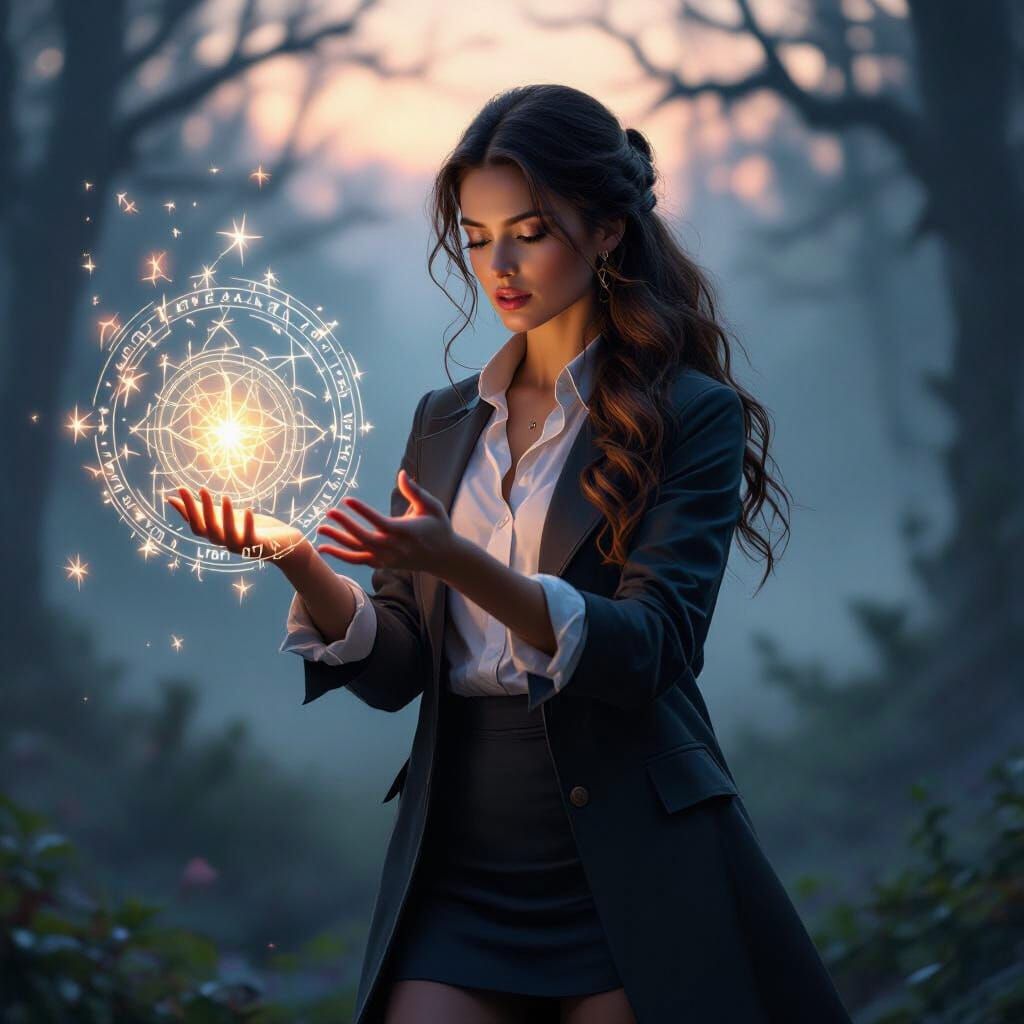 This concept art depicts an elegant woman casting a magical search spell in a twilight forest clearing. Swirling esoteric symbols and dynamic backlighting enhance the mystical atmosphere.