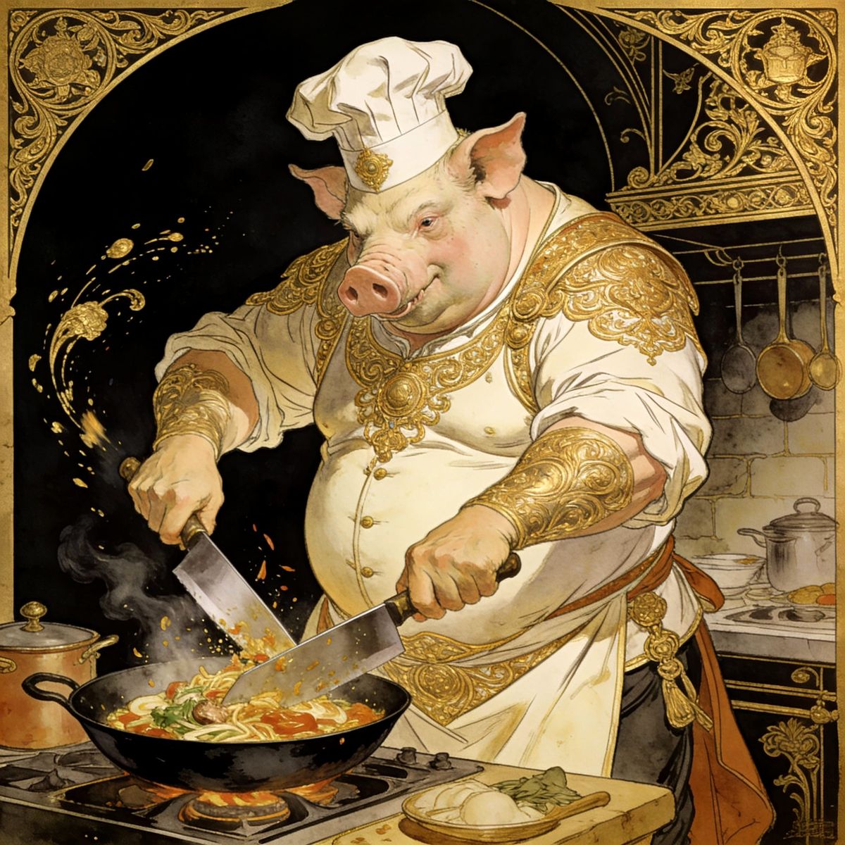 This image depicts a corpulent figure with a realistic pig head furiously chopping and cooking a masterpiece. Rendered in a detailed matte painting style with deep colors and fantastical intricate detail.